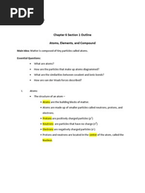 Chapter 6 Section 1 Outline Atoms Elements And Compound Pdf Chemical Compounds Atoms